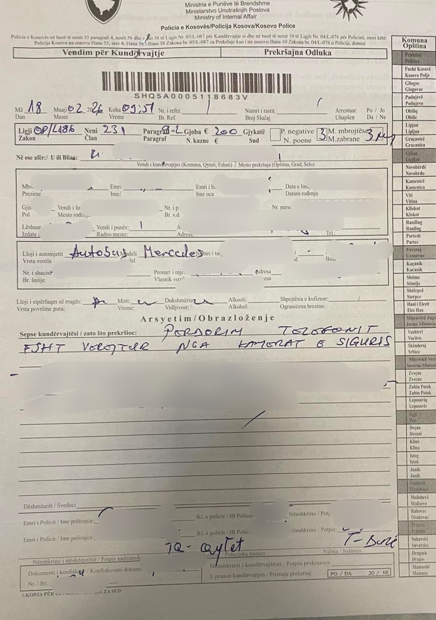 Po ashtu, pas verifikimit ka rezultuar se shoferi ka përsëritur kundërvajtjen për herë të dytë, andaj i është sekuestruar patentë-shoferi dhe i është shqiptuar masa e ndalimit të drejtimit të mjetit motorik për një periudhë prej tre muajsh, shkruan Arbresh.info.