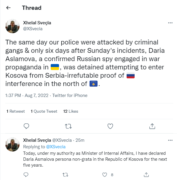 “Sot në autoritetin tim si Ministër i Punëve të Brendshme, e kam shpallur Daria Aslamovën persona non grata në Republikën e Kosovës për pesë vitet e ardhshme, deklaroi ministri në twitter. /arbresh.info/