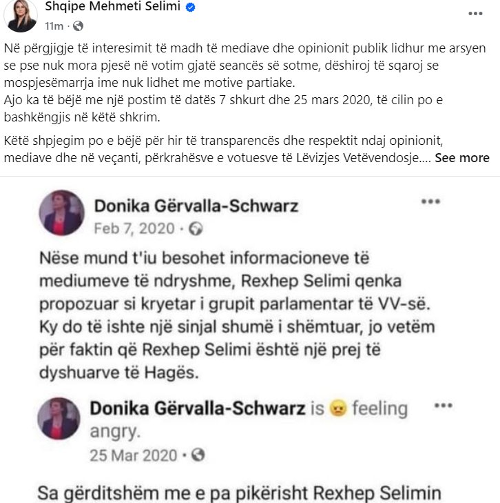 “Në përgjigje të interesimit të madh të mediave dhe opinionit publik lidhur me arsyen se pse nuk mora pjesë në votim gjatë seancës së sotme, dëshiroj të sqaroj se mospjesëmarrja ime nuk lidhet me motive partiake. Ajo ka të bëjë me një postim të datës 7 shkurt dhe 25 mars 2020, të cilin po e bashkëngjis në këtë shkrim. Këtë shpjegim po e bëjë për hir të transparencës dhe respektit ndaj opinionit, mediave dhe në veçanti, përkrahësve e votuesve të Lëvizjes Vetëvendosje. I falënderoj për mirëkuptimin kolegët, aktivistët dhe votuesit e Lëvizjes.”, ka shkruar Selimi./Arbresh.info/