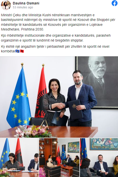 “Ministri Çeku dhe ministrja Kushi nënshkruan marrëveshjen e bashkëpunimit ndërmjet dy ministrive të sportit në Kosovë dhe Shqipëri për mbështetje të kandidaturës së Kosovës për organizimin e Lojërave Mesdhetare, ‘Prishtina 2030’. Kjo mbështetje institucionale dhe organizative e kandidaturës, parasheh organizimin e sportit të lundrimit në bregdetin shqiptar. Ky është një angazhim tjetër i përbashkët për zhvillim të sportit në nivel kombëtar”, ka shkruar në “Facebook”, Daulina Osmani, zëvendësministre e Ministrisë së Kulturës, Rinisë dhe Sportit.