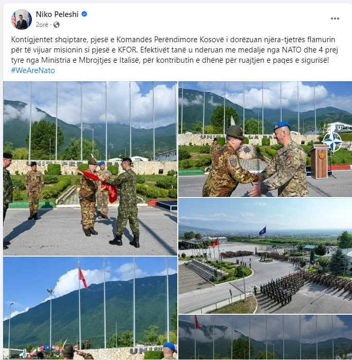 “Kontigjentet shqiptare, pjesë e Komandës Perëndimore Kosovë i dorëzuan njëra-tjetrës flamurin për të vijuar misionin si pjesë e KFOR. Efektivët tanë u nderuan me medalje nga NATO dhe 4 prej tyre nga Ministria e Mbrojtjes e Italisë, për kontributin e dhënë për ruajtjen e paqes e sigurisë! #WeAreNato”, ka shkruar Peleshi./Arbresh.info/