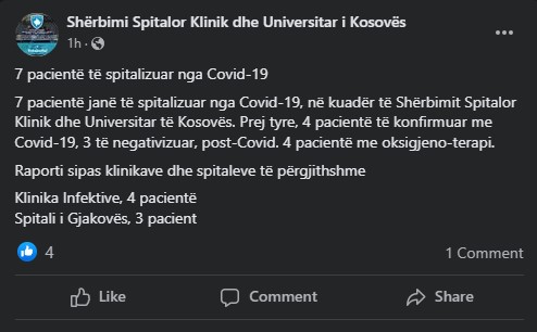 Shtatë pacientë janë të spitalizuar nga COVID-19, në kuadër të Shërbimit Spitalor Klinik dhe Universitar të Kosovës.