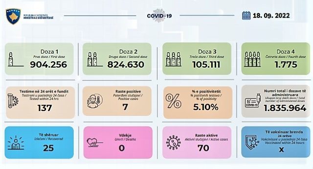 Shtatë raste të reja me COVID-19 janë regjistruar në 24 orët e fundit në Kosovë.