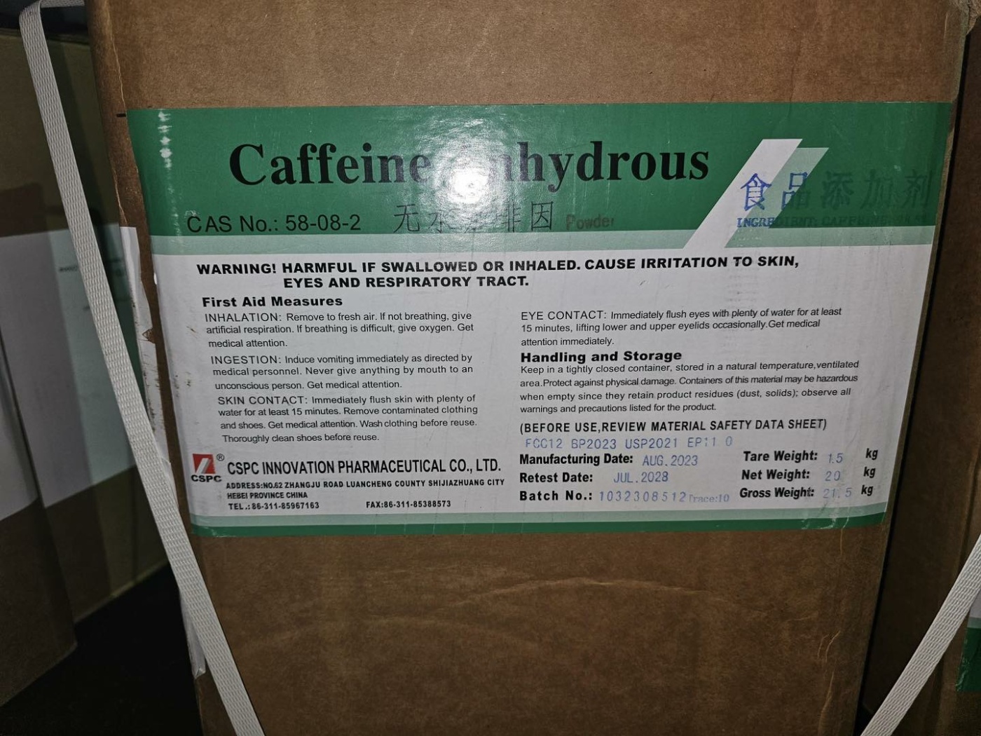“ Caffeine Anhydrous “ ne forme pluhuri 5 pako x 20 kg = 100 kg me origjine nga Kina.