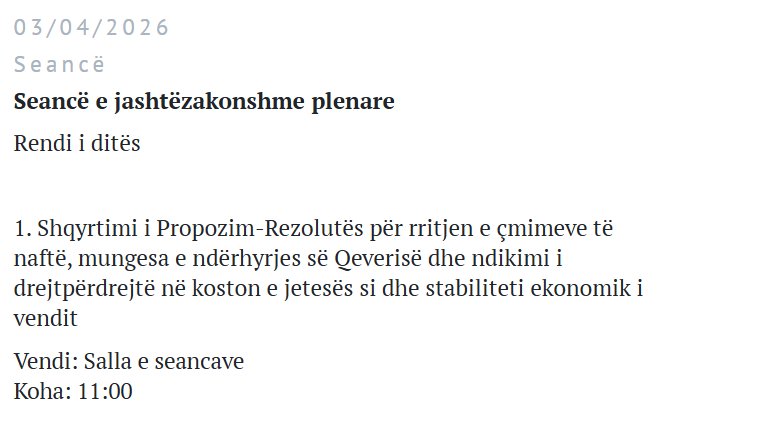 Deputetët e Kuvendit të Republikës së Kosovës do të mblidhen nesër, e premte, në një seancë të jashtëzakonshme parlamentare në lidhje me rritjen e çmimit të naftës, mungesën e ndërhyrjes së Qeverisë dhe ndikimin e drejtpërdrejtë në koston e jetesës dhe stabilitetit ekonomik të vendit.