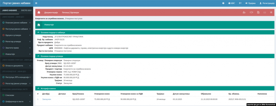 Detajet e marrëveshjes së lidhur midis Elektrokosmetit dhe Industrisë së Naftës së Serbisë, të disponueshme në portalin e prokurimeve publike.