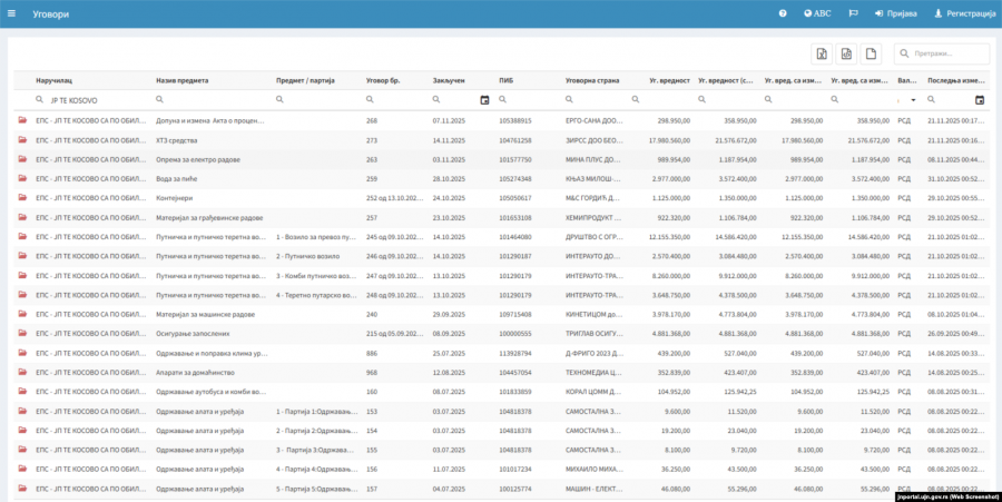 Lista në portalin e prokurimeve publike të Serbisë, ku shfaqen disa nga kontratat që Termocentralet e Kosovës kanë lidhur me kompani në Serbi.