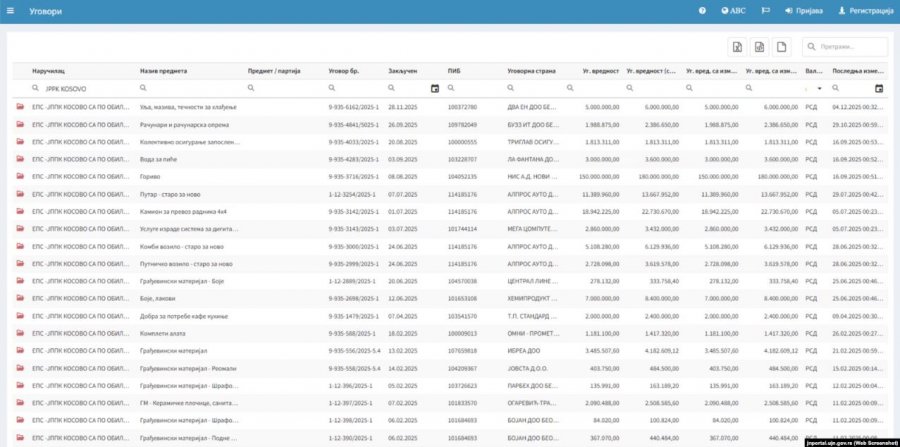 Lista e disa prej kontratave që ndërmarrja Minierat Sipërfaqësore të Kosovës ka lidhur me kompani në Serbi gjatë vitit 2025, e disponueshme në portalin e prokurimeve publike.