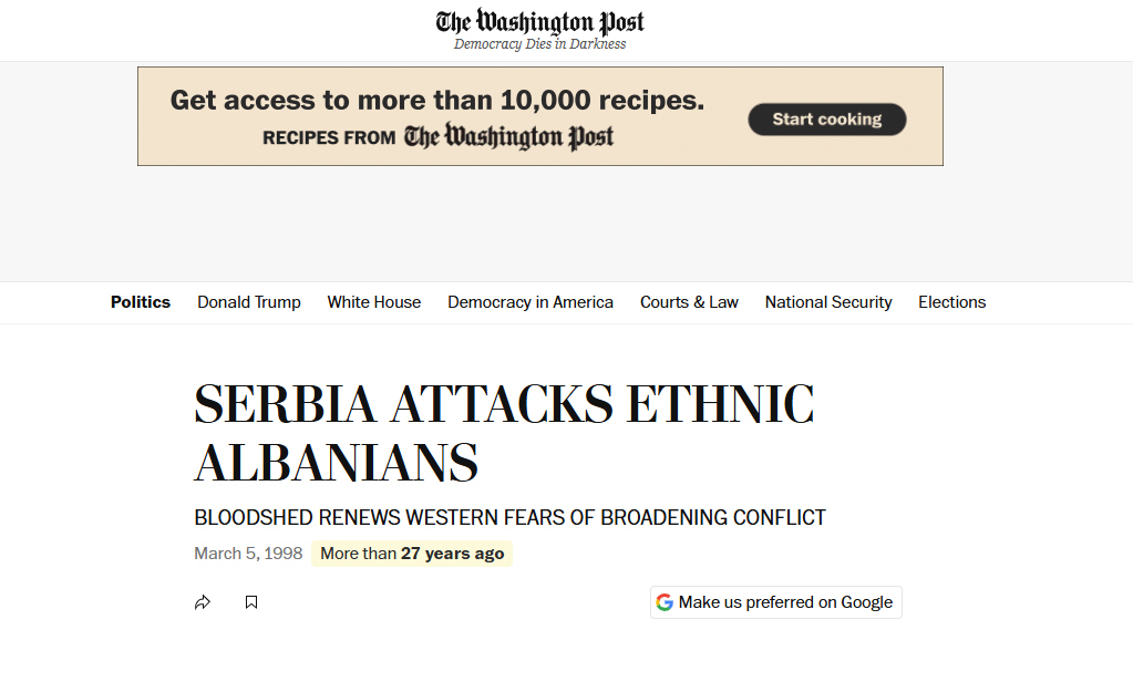 Gazeta amerikane The Washington Post, në një shkrim 28 vite (mars 1998) më parë të botuar, shkruan se forcat serbe nisën një sulm të ri ndaj shqiptarë etnikë, duke sulmuar fshatrat përreth kryeqytetit në një operacion që shqetësoi administratën e Clintonit dhe qeveritë e tjera perëndimore.