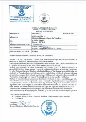 Sindikata e Policisë së Kosovës, me datë 15.09.2022, nga Thesari i Kosovës ka pranuar njoftimin për procesin e dixhitalizimit të deklarimit të anëtarësisë sindikale përmes platformës e-Kosova.