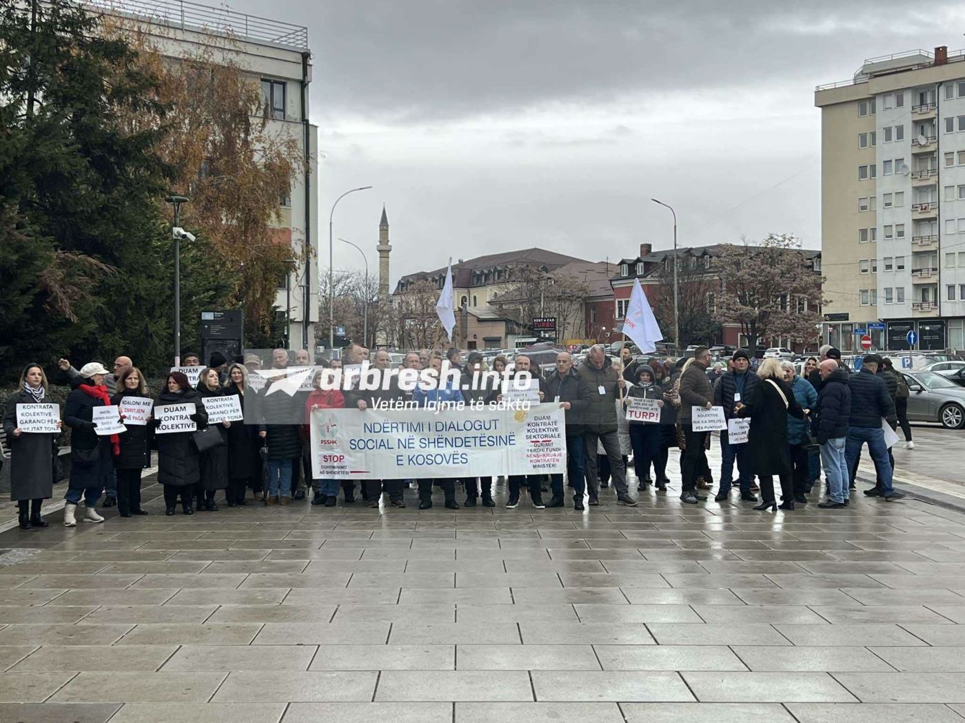 Federata e Sindikatave të Shëndetësisë së Kosovës (FSSHK) ka organizuar sot një protestë para Kuvendit të Republikës së Kosovës, duke shprehur pakënaqësinë ndaj politikave të Qeverisë lidhur me sektorin e shëndetësisë.