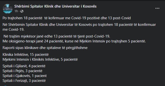 Shërbimi Spitalor, Klinik, Universitar I Kosovës ka njoftuar se në QKUK dhe në spitalet e përgjithshme janë duke u trajtuar 18 pacientë për Covid-19.