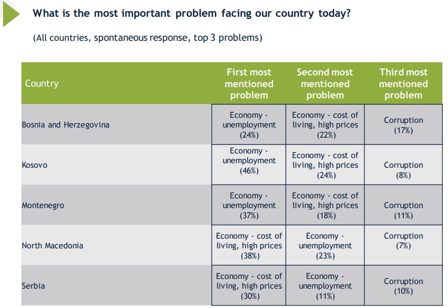 Në tri problemet kryesore të listuara nga sondazhi i institutit amerikan IRI, papunësia (46%) është problemi kryesor, e pasuar nga kostoja i jetesës/ çmimet e larta (24%) dhe korrupsioni (8%).