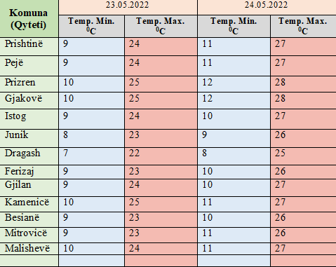 Minimalet do të lëvizin ndërmjet 7-13 gradë Celsius, ndërsa maksimalet e ditës parashihen të lëvizin ndërmjet 23-32 gradë Celsius.