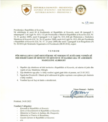 Kosova e ka shpallur ditë zie sot, në nderim të jetës dhe veprës së Sekretares amerikane të Shtetit, Madeleine Albright, e cila vdiq të mërkurën.
