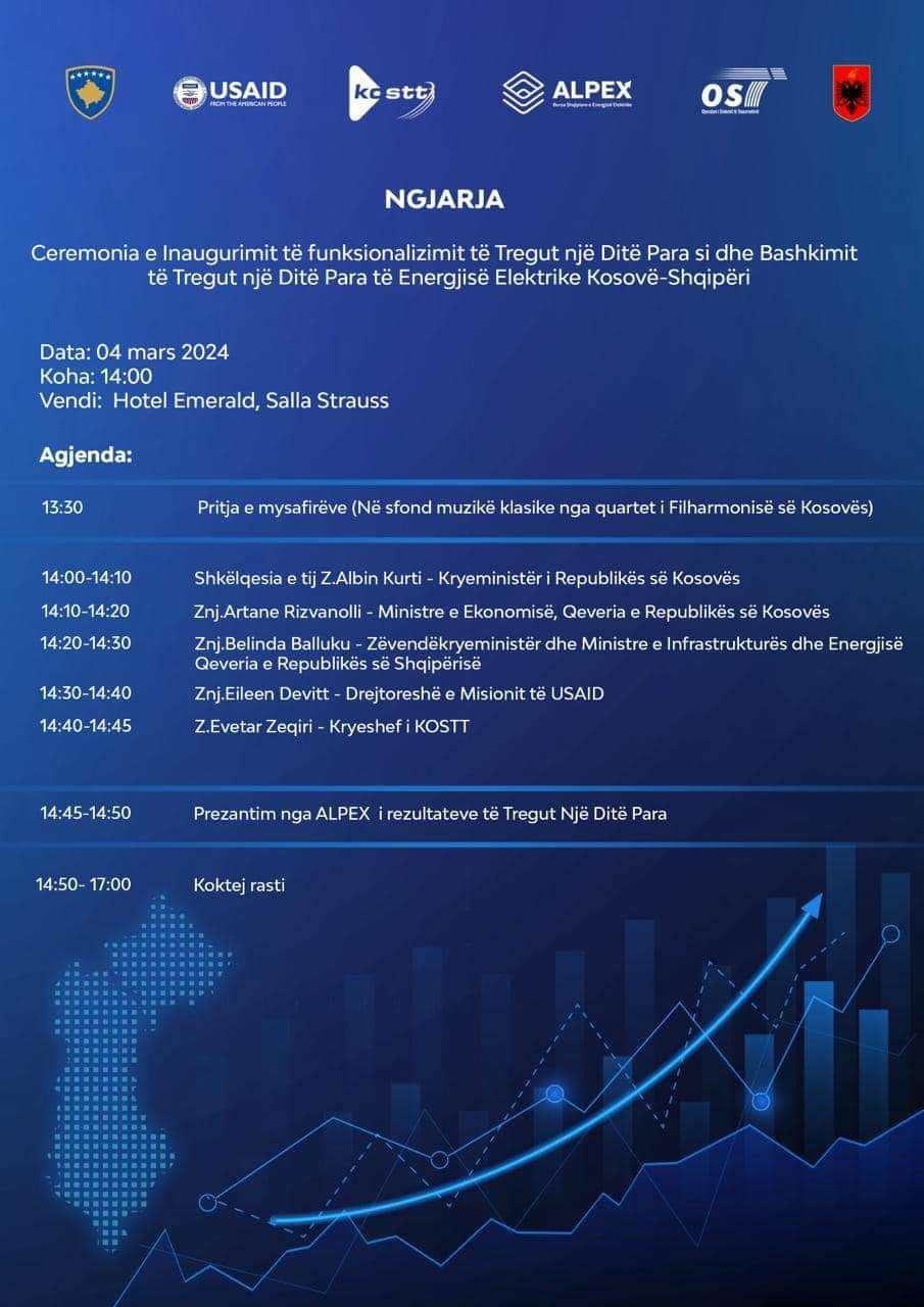 Bursa Shqiptare e Energjisë Elektrike ALPEX ka njoftuar se sot mbahet ceremonia zyrtare me rastin e funksionalizimit të Tregut një Ditë Para për Zonën Ofertuese të Kosovës dhe Bashkimi i Tregjeve.