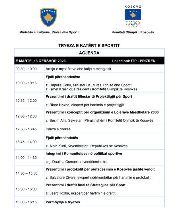 Ndërkaq, në 13:45, një fjalë përshëndetëse në Tryezën e Sportit, do të mbajë edhe Kryeministri i Kosovës, Albin Kurti./Arbresh.info/