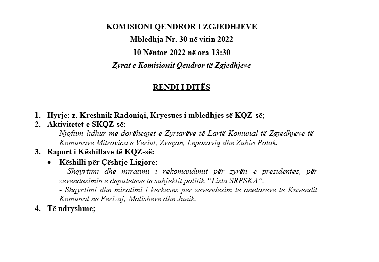 Në rend dite është edhe njoftim lidhur me dorëheqjet e Zyrtarëve të Lartë Komunal të Zgjedhjeve të Komunave Mitrovica e Veriut, Zveçan, Leposaviq dhe Zubin Potok./arbresh.info/