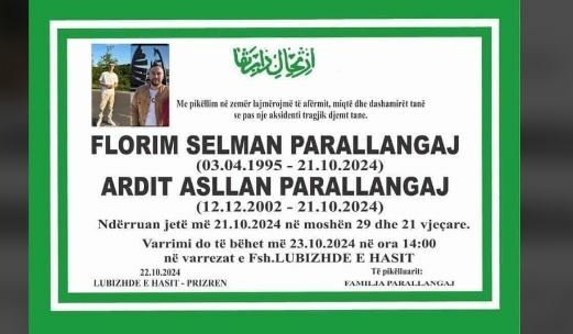 Sipas njoftimit nga familjarët e të ndjerëve, varrimi i Florim dhe Ardit Parallangaj, do të bëhet me fillim nga ora 14:00.