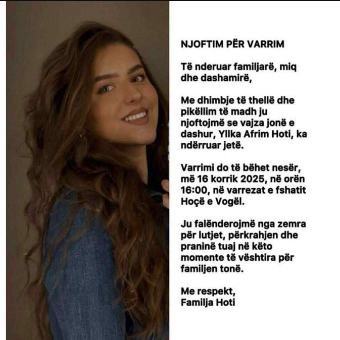 Yllka Hoti, e cila vdiq pas një aksidenti në Gjermani, do të varroset sot në fshatin Hoçë e vogël e Rahovecit.
