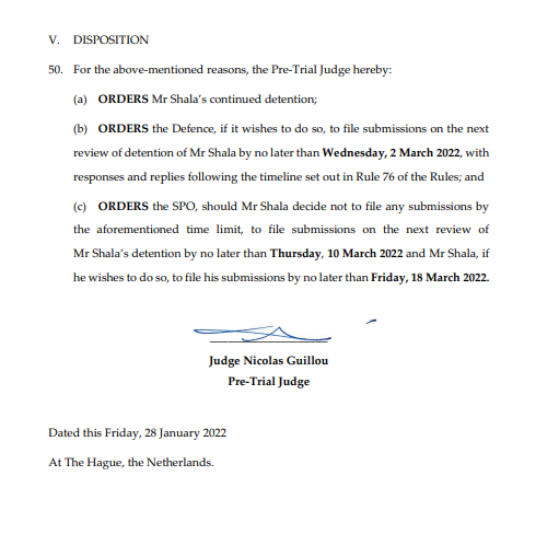 Gjykatësi i procedurës paraprake ka dhënë urdhër që mbrojtja e Shalës të dërgojë parashtresat në lidhje me rishikimin e masës së paraburgimit tjetër të paraburgimit deri më 2 mars.