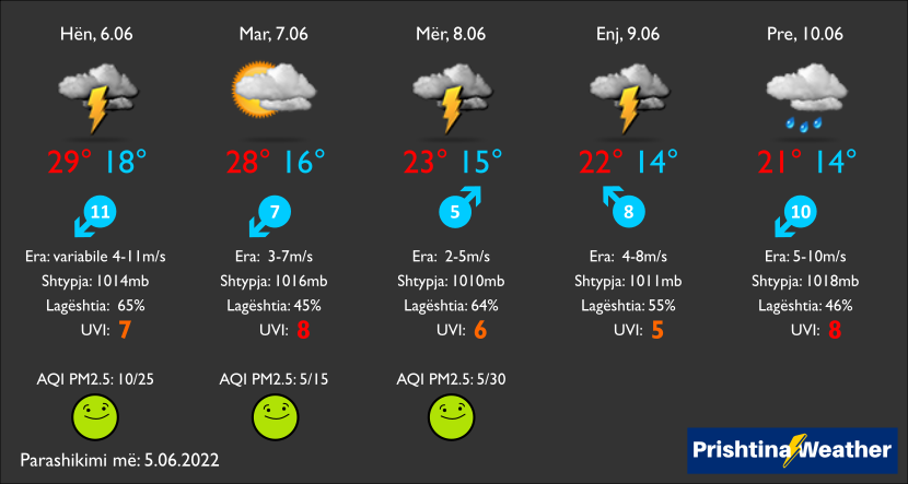 Temperaturat do pësojnë rënie, minimalet luhaten zbresin nga 18C në 14C, e maksimalet nga 28C e 29C, në 22C e 21C deri të enjten dhe premte.