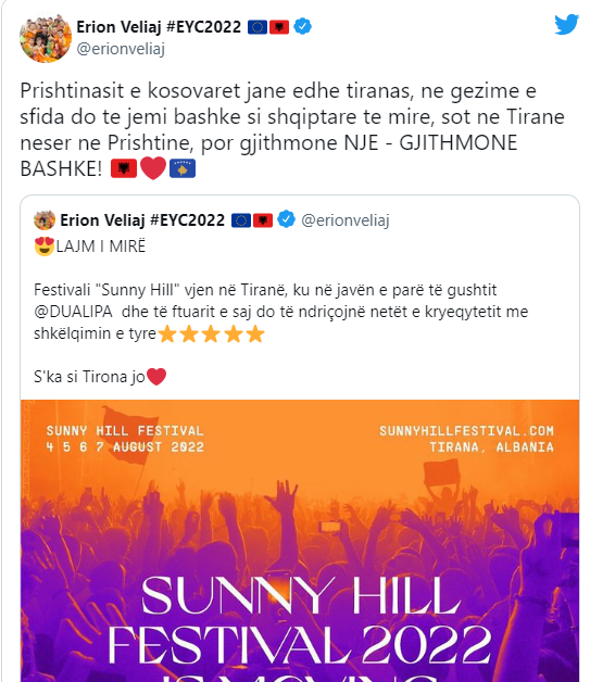 Kryetari i Tiranës, Erion Veliaj, ka reaguar pas zhvendosjes së festivalit “Sunny Hill” nga Kosova në Shqipëri.