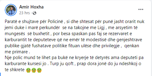 Në statusin e tij, ai fliste edhe për pakënaqësitë e tij në lidhje me pagesat për karburante dhe pagesa tjera për deputetët.