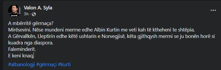 Përmes një statusi në “facebook”, Syla ka porositur mërgimtarët që kur të kthehen në vendet ku jetojnë ta marrin me vete kryeministrin Kurti.
