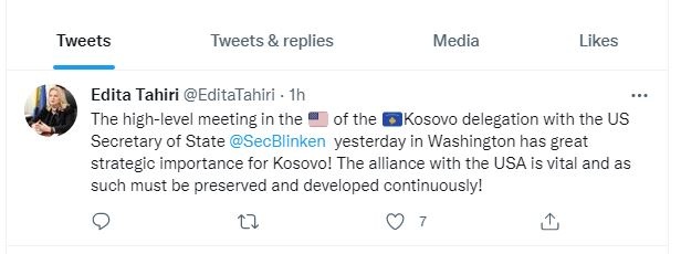 “Takimi i nivelit të lartë në ShBA në mes të delegacionit kosovar dhe Sekretarit amerikan të Shtetit Antony Blinken dje në Washington ka rëndësi të madhe strategjike për Kosovën. Aleanca me ShBA-në është jetike dhe si e tillë duhet të ruhet dhe zhvillohet në vazhdimësi”, ka shkruar Tahiri në Twitter.
