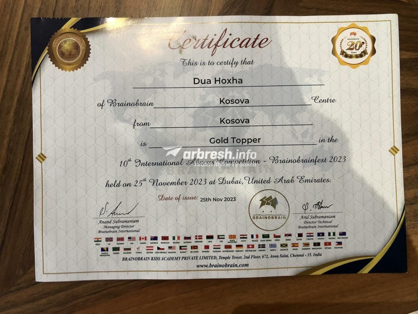 Dua ka arritur që ta përfaqësojë shtetin e Kosovës bashkë me 28 fëmijë të tjerë nga vendi jonë në garat ndërkombëtare të “Brainobrain International në Aritmetikën Mentale” të mbajtura në Dubai.