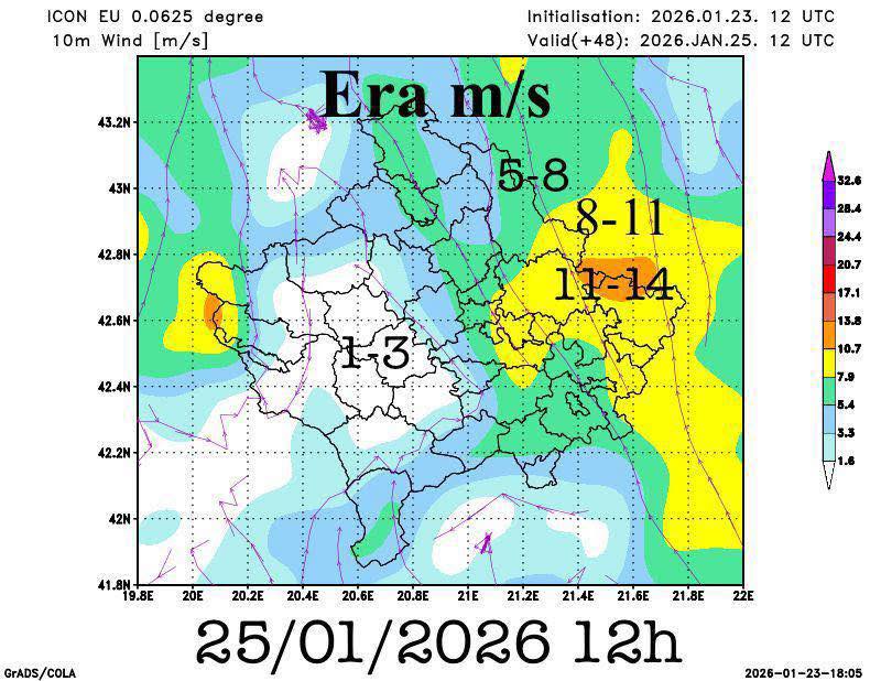 Sipas këtij paralajmërimi, erë e fortë 11–14 m/s pritet të mbretërojë në zonat kodrinoro-malore, kurse erë mesatarisht e fortë, 8–11 m/s, në zonat më të ulëta.