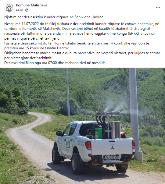 Në njoftimin e komunës bëhet e ditur se dezinsektimi bëhet në kuadër të zbatimit të strategjisë nacionale për luftimin dhe parandalimin e Etheve Hemorragjike Krime Kongo (EHKK), virus i cili përmes rriqrave përcillet tek njeriu.
