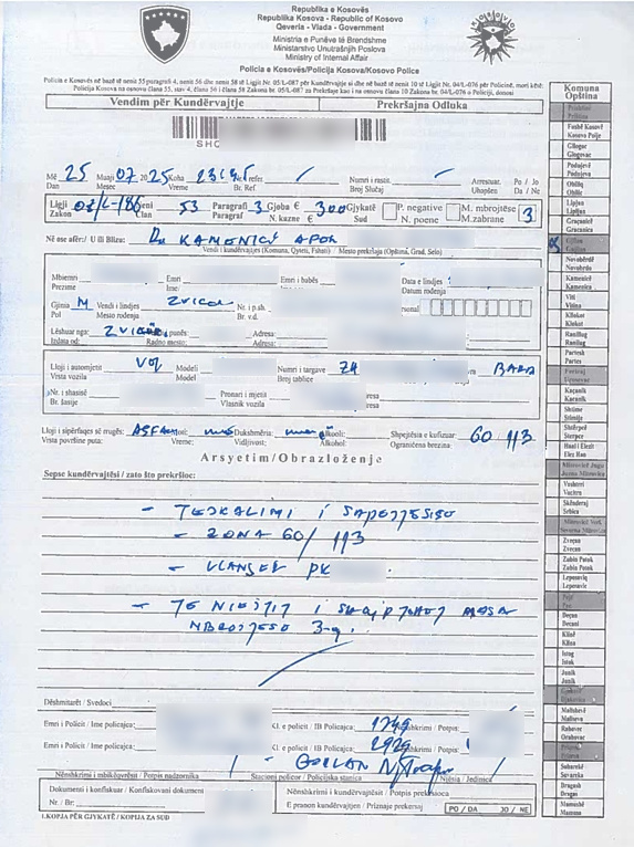 Zyrtarët policorë të Njësisë për Komunikacionit Rrugor nga Drejtoria rajonale e Policisë në Gjilan, gjatë realizimit të detyrave të rregullta për kontrollin e trafikut rrugore në pikë kontrollit të automjeteve në rrugën nacionale Gjilan – Kamenicë, kanë ndaluar një automjet me targa ZH (Zvicerane) i cili në zonën ku kufizimi i shpejtësisë është i përcaktuar me shenjë të trafikut gjashtëdhjetë (60) km/h duke vozitur njëqind e trembëdhjetë (113) km/h.