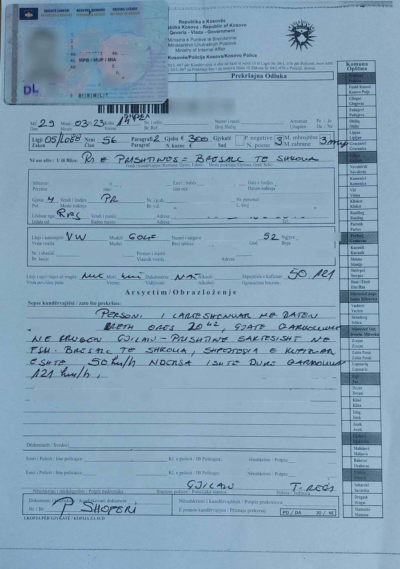 Të njëjtit i është shqiptuar gjoba në vlerë prej 300 euro, konfiskuar patentë shoferi me masa e përkohshëm e ndalim vozitjes në afat prej tre muaj dhe tri pikë negative./arbresh.info/