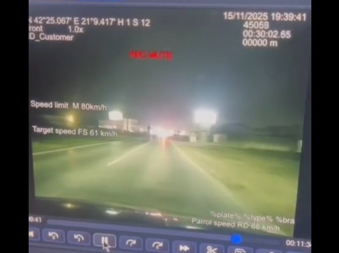 Policët e Njësisë së Komunikacionit Rrugor në Ferizaj, më datë 15.11.2025 rreth orës 19:40, në rrugën magjistrale Ferizaj–Prishtinë, në fshatin Prelez i Jerlive, kanë ndaluar shoferin M.S. (37 vjeç), i cili, duke drejtuar veturën VW Golf me targa vendore, ishte kapur duke lëvizur me shpejtësi 124 km/h në zonë me kufizim 60 km/h.
