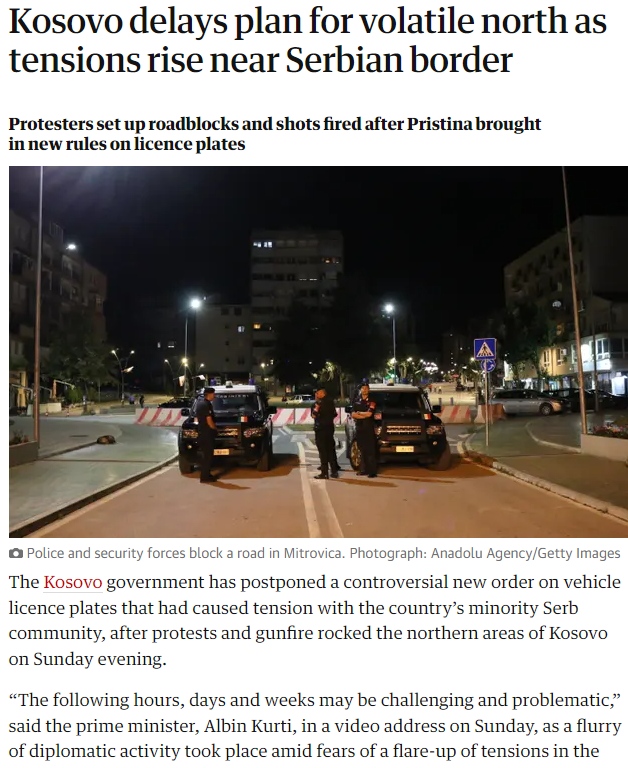 Lidhur me zhvillimet e së dielës ka raportuar edhe gazeta britanike The Guardian. Në artikullin e saj, The Guardian përmend deklaratat e kryeministrit Kurti se “orët, ditët dhe javët në vijim mund të jenë sfiduese dhe problematike”, ndërsa citon edhe presidentin serb, Aleksandar Vuçiq, i cili tha se “do të luten për paqe, por nuk do të ketë dorëzim dhe Serbia do të fitojë”.