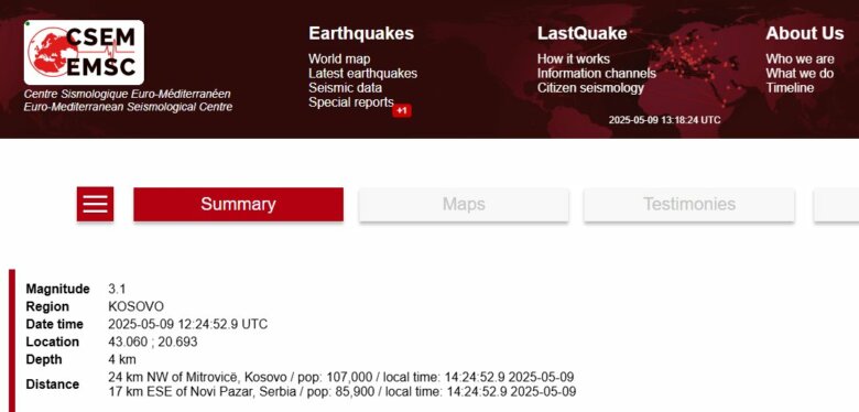 Një tërmet prej 3.1 shkallësh është shënuar në afërsi të qytetit të Mitrovciës, sipas faqes që regjistron tërmetet “ECMS”.