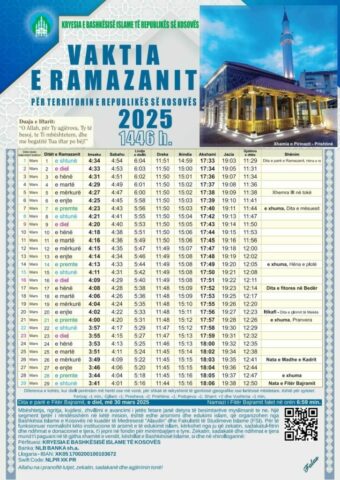 Në kalendarin mysliman bëhet e ditur se dita e parë e Ramazanit do t’i bie ditën e shtune, ndërsa syfyri do të nis në orën 04:34.