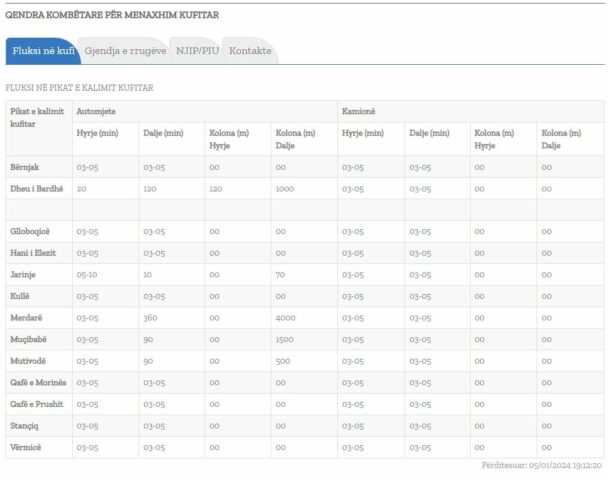 Sipas të dhënave të Qendrës Kombëtare për Menaxhim Kufitar, të përditësuar në orën 19 e 12 minuta, pritjet më të gjata, për të dalë nga Kosova, vazhdojnë të jenë në Merdarë dhe te Dheu i Bardhë, ku pritjet janë rreth 2 orë, kurse kolona e automjeteve arrin në një kilometër.