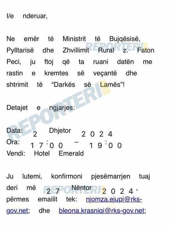 Për këtë “organizim paralel”, Ministri i Bujqësisë ka nisur t’i shpërndajë edhe ftesat. Një prej tyre e ka siguruar gazeta online Reporteri.net.