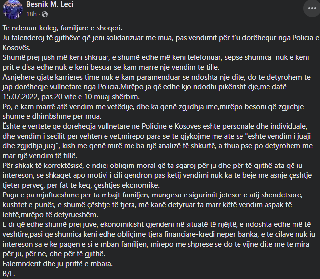 “Është e vërtetë që dorëheqja vullnetare në Policinë e Kosovës është personale dhe individuale, dhe vendim i secilit për vehten e vet,mirëpo para se të gjykojmë me atë se “është vendim i juaji dhe zgjidhja juaj”, kish me qenë mirë me ba një analizë të shkurtë, a thua pse po detyrohem me marr një vendim të tillë.Për shkak të korrektësisë, e ndiej obligim moral që ta sqaroj për ju dhe për të gjithë ata që iu intereson, se shkaqet apo motivi i cili qëndron pas këtij vendimi nuk ka të bëjë me asnjë çështje tjetër përveç, për fat të keq, çështjes ekonomike”, ka shkruar Leci.