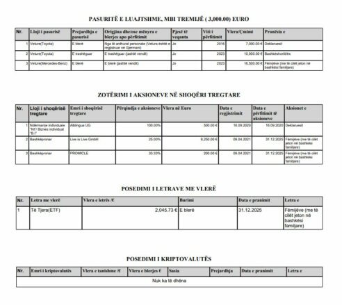 Gjithashtu, ajo ka deklaruar në emër të bashkëshortit një pyll 10,000 m², trashëguar pas vdekjes së babait, me vlerë 10 mijë euro.