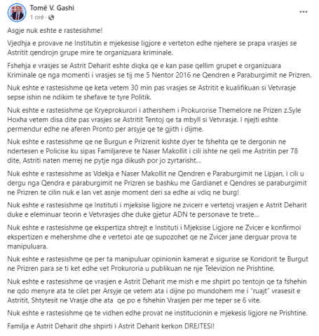 Gashi ka shtuar ndër të tjerash se, “Prapa vrasjes së Astrit Deharit qëndrojnë grupe mirë të organizuara kriminale”