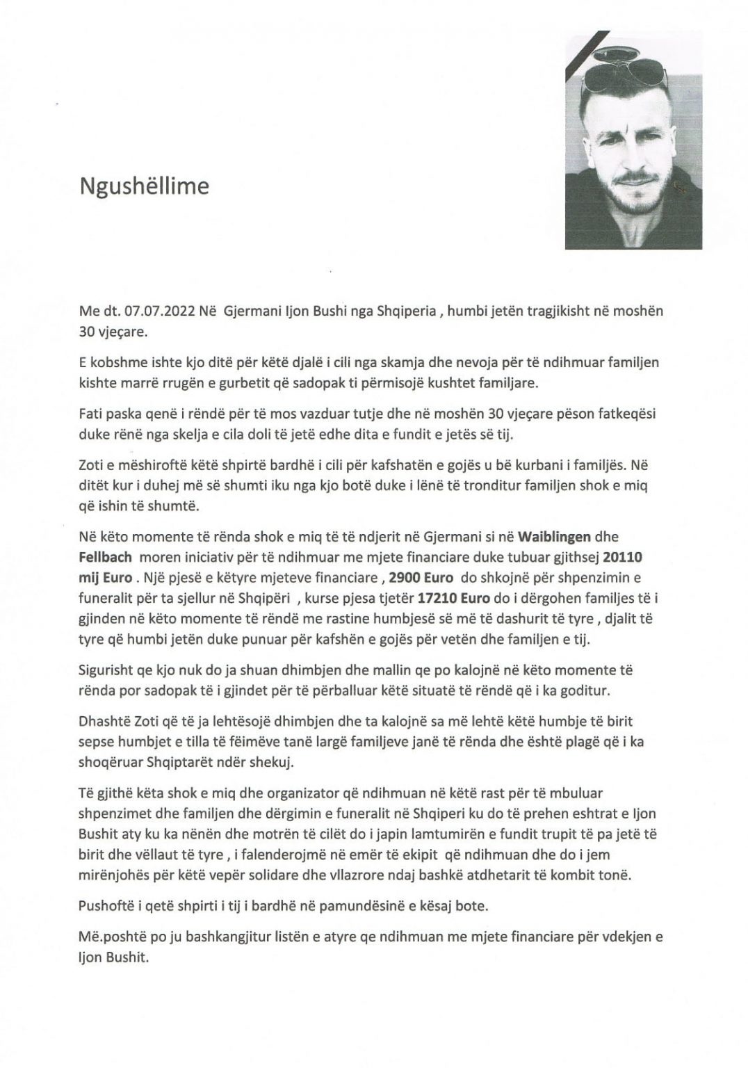 “Në këto momente të rënda, shokë, miq të të ndjerit në Waiblingen dhe Fellbach, kanë marrë iniciativë për të ndihmuar me mjete financiare, duke mbledhur mbi 20 mijë euro. 2900 do të shkojnë për shpenzimet e funeralit dhe pjesën tjetër 17.210 euro do t’i dërgohen familjes së tij”, thuhet ndër të tjera në letrën ngushëlluese.