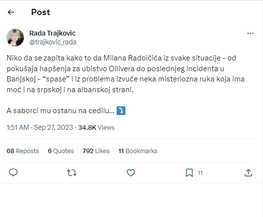 Përmes një postimi në Twitter ajo ka shkruar se “Askush nuk duhet të pyesë se si Milan Radoiçiq u “shpëtua” nga çdo situatë nga tentativa e arrestimit për vrasjen e Oliverit e deri te incidenti i fundit në Banjska dhe u tërhoq nga problemi nga një dorë misterioze që ka fuqi si mbi serbët ashtu edhe mbi shqiptarët. Dhe shokët e tij kanë mbetur në baltë./Arbresh.info