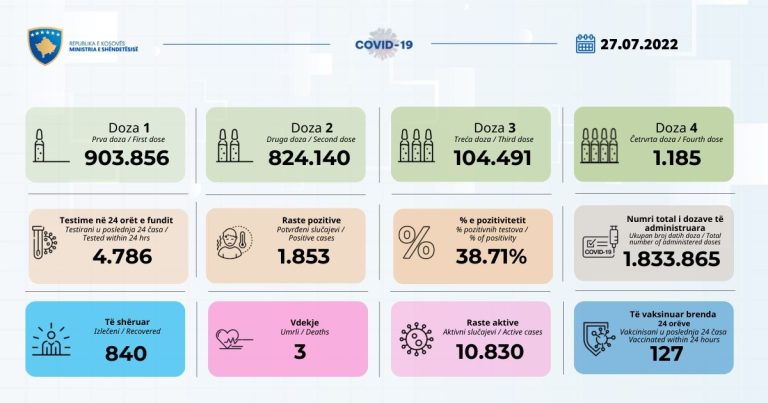 Tre persona kanë vdekur në 24 orët e fundit në Kosovë si pasojë e koronavirusit. Ministria e Shëndetësisë njofton edhe për një numër të lartë të të infektuarve, gjithsej 1853, në 24 orët e fundit. Dje janë shëruar 840 persona, ndërkaq janë dhënë 127 doza të vaksinës anti-Covid. Aktualisht numri i rasteve aktive ka kaluar … Continue reading Tre të vdekur e afro dy mijë raste të reja me koronavirus në Kosovë