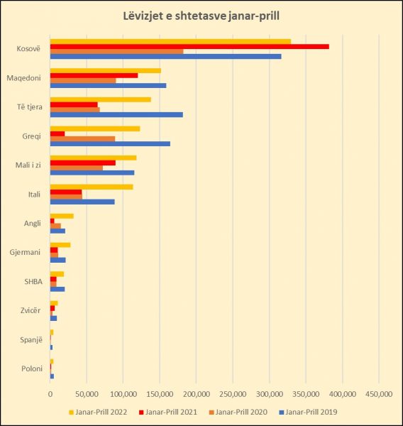 Gjatë katërmujorit të parë 2022, nga vendet që kanë hyrjet më të larta të shtetasve në Shqipëri, Greqia ka pasur rritjen më të madhe me 6 herë, ndërsa Kosova ka pasur rënien më të ndjeshme me 13,6%, krahasuar me të njëjtën periudhë të vitit 2021