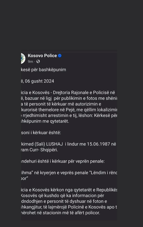 Policia e Kosovës ka kërkuar ndihmën e qytetarëve për kapjen e artistit Arkimed Lushaj të njohur si Stresi.