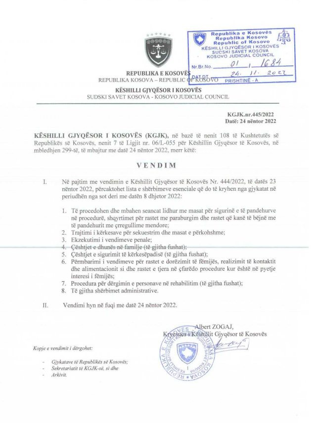 Këshilli Gjyqësor i Kosovës (KGJK) dhe Këshilli Prokurorial (KPK) këtë vendim nuk e kanë pritur aspak mirë, duke vendosur që nga e enjtja gjykatat dhe prokuroritë në gjithë Kosovën punojnë vetëm me raste emergjente, apo siç quhen në terminologjinë juridike, do të kryejnë vetëm shërbime esenciale.